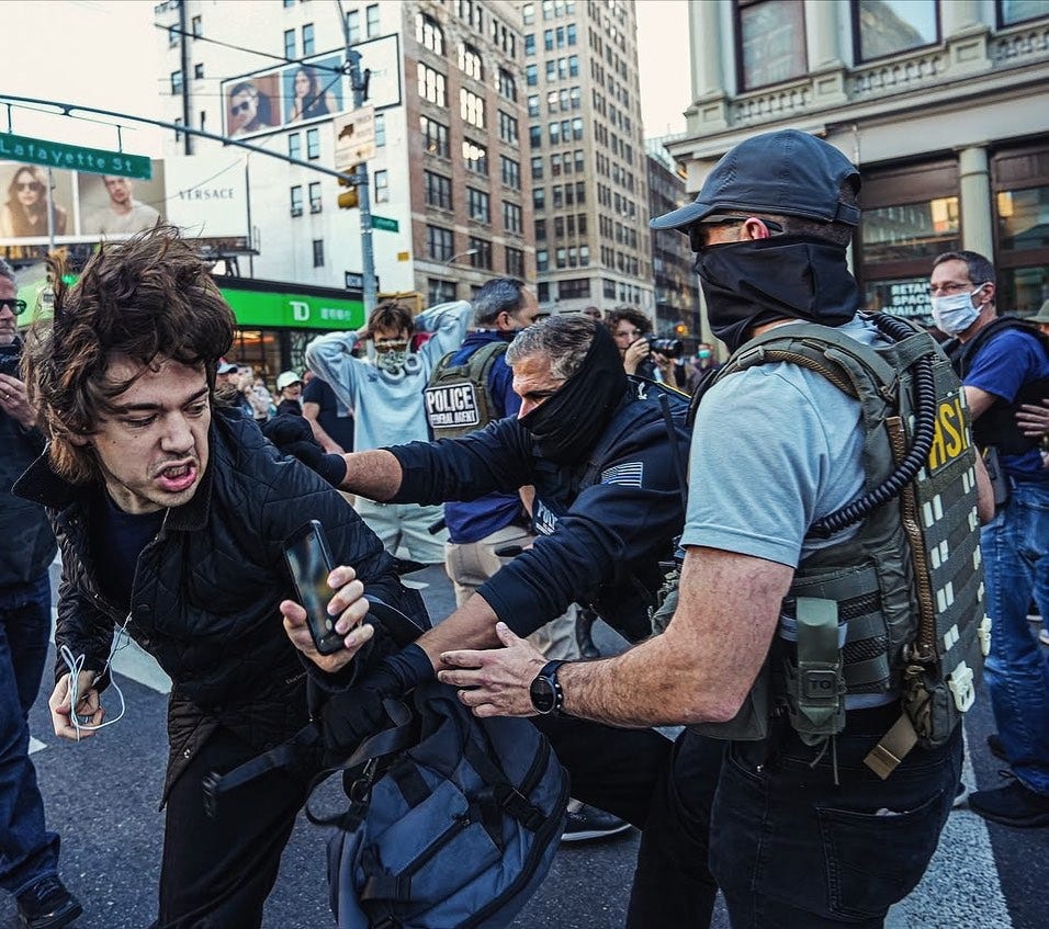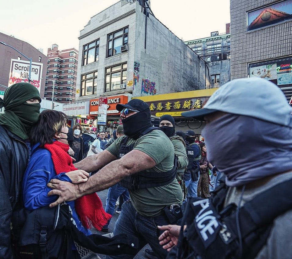 The scene quickly escalated as bystanders and protesters surrounded masked federal officers, attempting to block their vehicles while chanting “ICE out of New York” and calling on pedestrians to join them. Agents responded by threatening demonstrators with pepper spray and, in some cases, shoving protesters to the ground before detaining them.