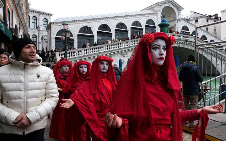 At the iconic Rialto Bridge in Venice, demonstrators hung a banner reading “Stop Ecocide” across the Grand Canal. Activists dressed entirely in red with veils covering their faces staged a slow-moving flash mob through crowds of curious tourists, creating a theatrical display meant to symbolize a planet in crisis.